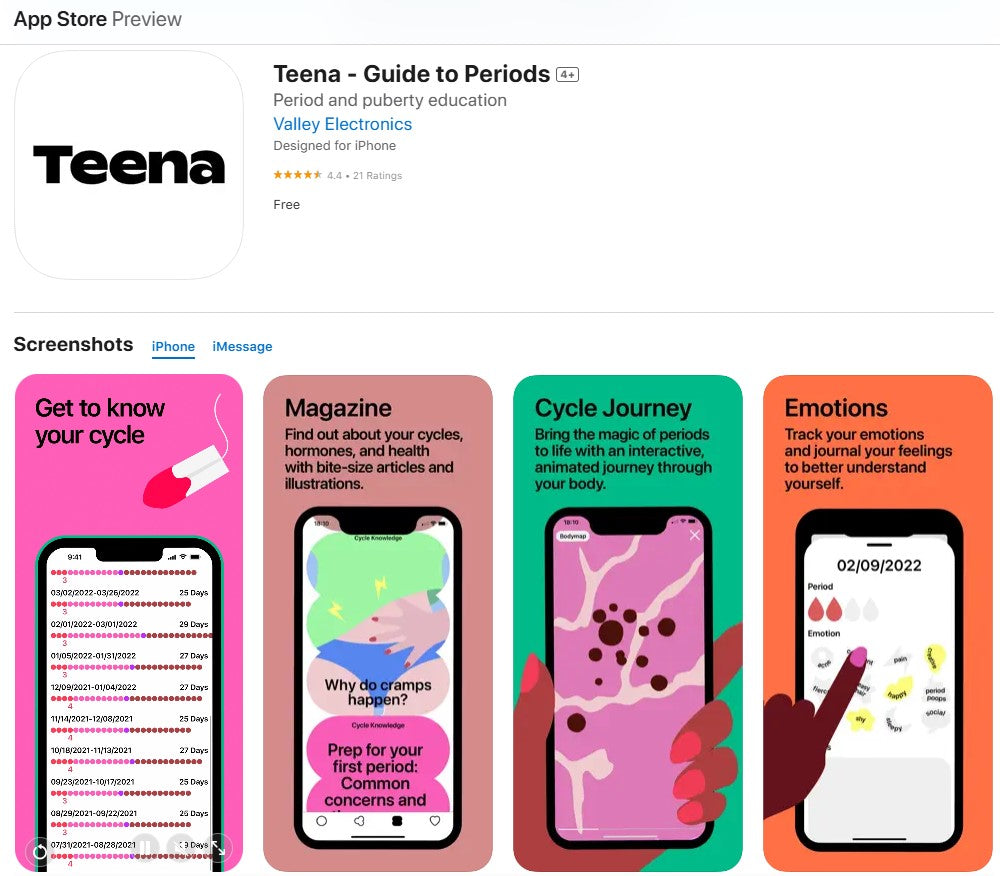 Teena AppThe all-new Teena App helps you be period ready! Using knowledge gained from decades of experience in cycle tracking and women’s health, Teena is designed to support pre-teens and teens through their first years of menstruation. Not just a period tracker, Teena App helps provide answers to the questions you didn’t know you had and those you don’t know who to ask. Decoding the body’s magic in a way that makes sense!